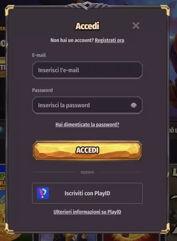 Per completare il login Dragonia, apri il nostro sito e seleziona il pulsante di accesso in alto nella pagina. Inserisci l’indirizzo email usato all’iscrizione e la password creata. Se i dati sono corretti, verrai portato alla dashboard dell’account.