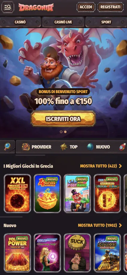 Il gioco da mobile ti permette di aprire un gioco in pochi secondi, sia che tu sia a casa sia lontano dalla scrivania. Su Dragonia Casino, costruiamo la nostra esperienza mobile per essere familiare, veloce e facile da controllare, con menu chiari e prestazioni stabili sui piccoli schermi. Puoi esplorare migliaia di titoli, passare tra casinò e sportsbook e gestire il saldo senza cambiare dispositivo. La nostra libreria include slot, tavoli con croupier dal vivo e scommesse sportive, così puoi mantenere le stesse opzioni che ti aspetti su desktop. Per un accesso rapido all’account, le nostre pagine sono progettate per rendere il login Dragonia sempre semplice, anche con connessioni congestionate. Se sei nuovo, la registrazione Dragonia è breve e puoi impostare subito i limiti. Supportiamo i giocatori italiani con opzioni bancarie in EUR, assistenza via chat live e strumenti di sicurezza pensati per rendere il gioco più sicuro.