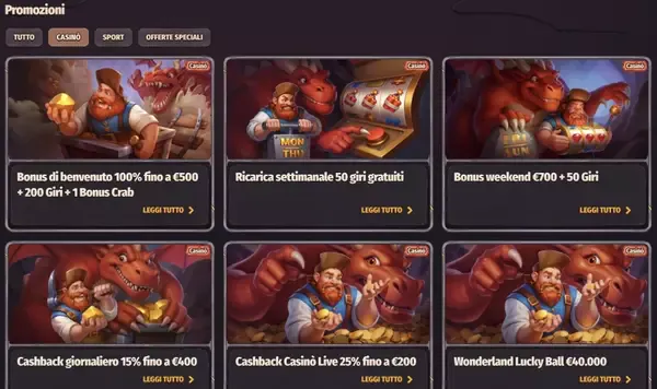 Benvenuto nella nostra pagina promozioni per i giocatori in Italia. Da Dragonia Casino, manteniamo le regole dei bonus chiare, con ricompense pratiche per i giochi da casinò e le scommesse sportive. Puoi esplorare 11.000 giochi, inclusi tavoli live di Evolution Gaming e titoli popolari di Pragmatic Play, NetEnt e Play’n GO, oltre alle slot Dragonia e ai jackpot.